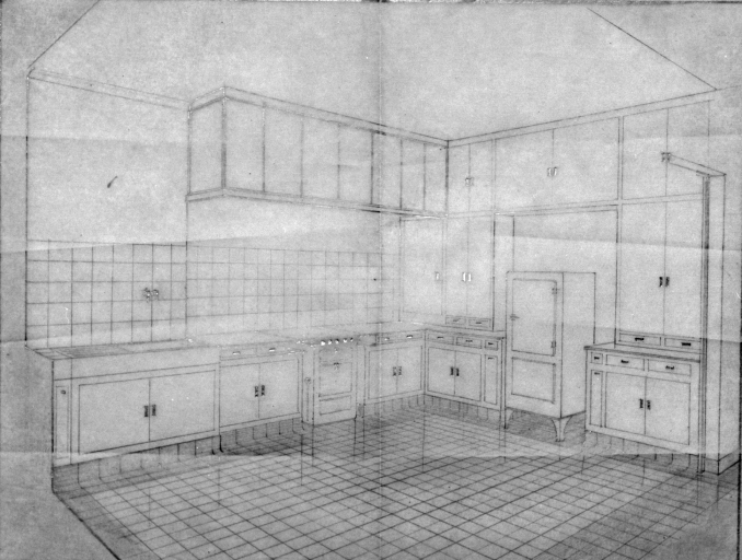 Vue axonométrique de la cuisine (A. P.)Immatriculation