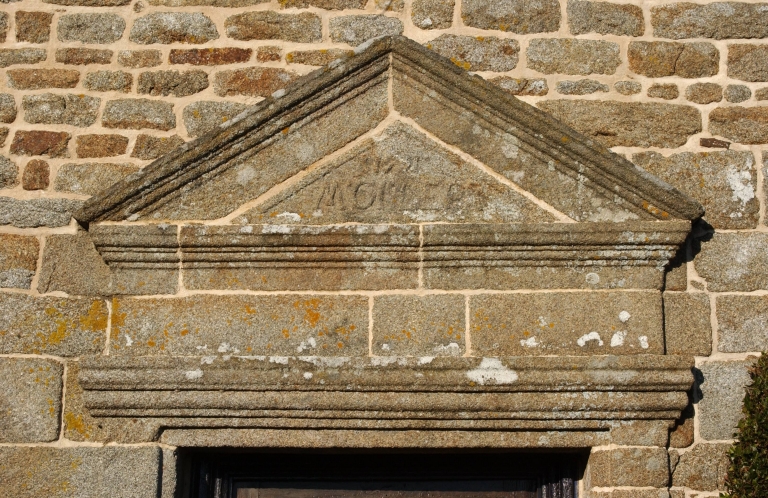 Détail : façade sud, fronton gravé de la porte d'entréeImmatriculation