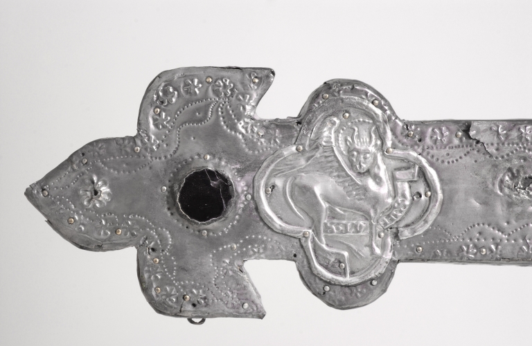 Croix de procession : avers, médaillon au boeuf de saint LucImmatriculation
