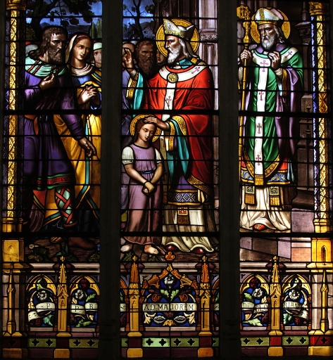 Ensemble des 7 verrières à personnages des baies 1 à 6, 100 : Scènes de la vie de la Vierge, Saint Joseph, Saint Michel, Ange gardien et Saint Louis de Gonzague (?), et des 4 verrières décoratives des baies 101 à 104,