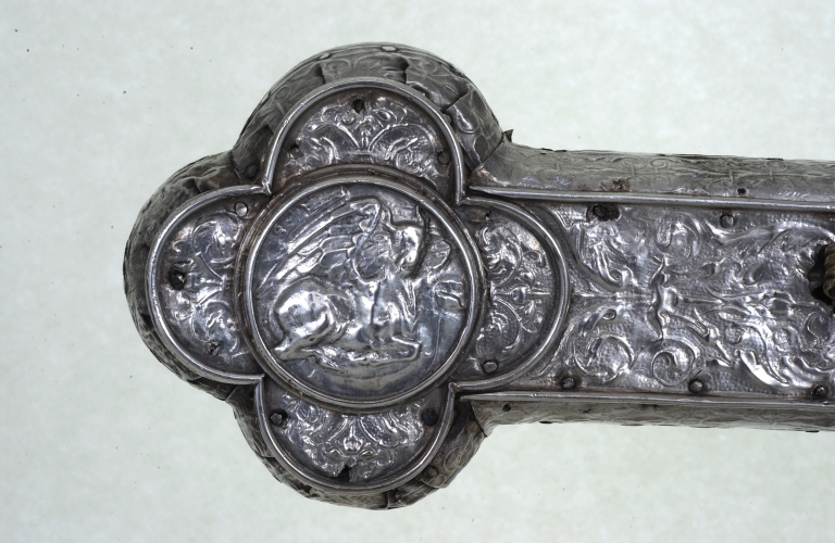 Face portant le Christ, fleuron gauche : boeuf de saint LucImmatriculation