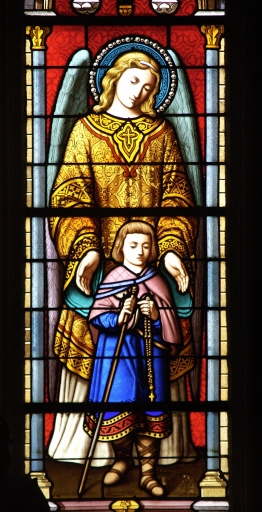 Verrières des baies 0, 1, 2, 7, 9, 11, 13, 15, 17 à 20, 00 : Scènes de la Vierge, Saint Joseph et l´Enfant, Enfant de Marie, Ange gardien, Sainte Hélène, Don des clés, Sainte Avoye, Saint Louis, Baptême du Christ, saint évêque, Don du Rosaire,