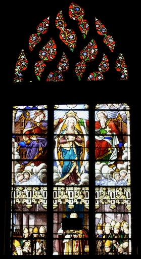 Verrières des baies 0, 1, 2, 7, 9, 11, 13, 15, 17 à 20, 00 : Scènes de la Vierge, Saint Joseph et l´Enfant, Enfant de Marie, Ange gardien, Sainte Hélène, Don des clés, Sainte Avoye, Saint Louis, Baptême du Christ, saint évêque, Don du Rosaire,