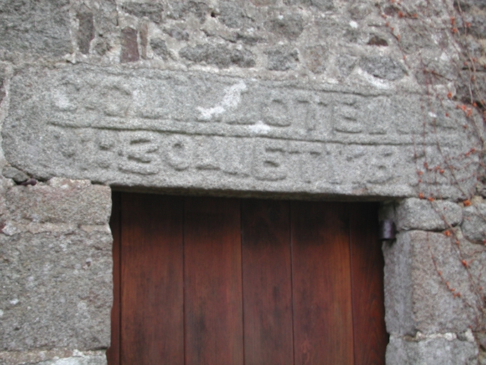 Détail : façade sud, linteau de porte gravé 'C:CUILLOTEL / M:BOUVET 1786'Immatriculation
