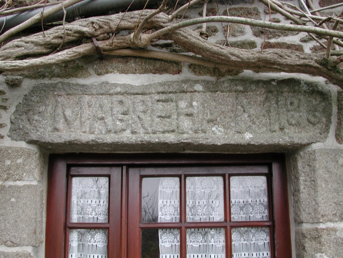 Détail : demeure dénaturée, linteau de porte gravé 'M:ABREHAM 1816' (parcelle D3 1191)Immatriculation