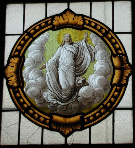 Ensemble des 6 verrières à personnages des baies 5 à 10 : Sainte Famille, Education de la Vierge, Apparition de la Vierge à Catherine Labouré, Apparition de saint Michel à Jeanne d'Arc, Ascension, Baptème du Christ (Lanhélin fusionnée en Mesnil-Roc'h en 2019),