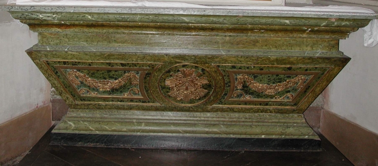 Ensemble de l'autel secondaire sud : autel, tabernacle, retable, 2 gradins d'autel (Lanhélin fusionnée en Mesnil-Roc'h en 2019),