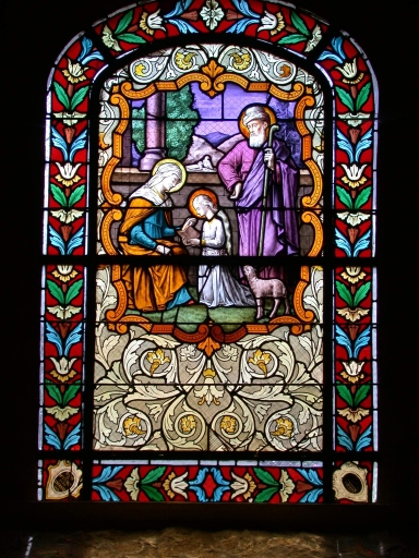 Verrières à personnages des baies 1 à 4, 6, 8, 10 : Apparition du Sacré Coeur à Marguerite Marie, Donation du Rosaire, saint Thurial et saint Eutrope, Education de la Vierge, saint Jean-Baptiste, saint Joseph, Baptême du Christ et 2 verrières décoratives,
