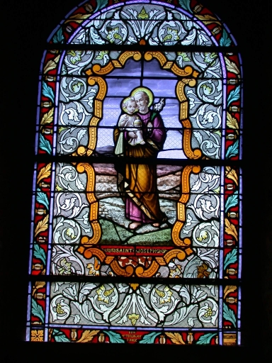 Verrières à personnages des baies 1 à 4, 6, 8, 10 : Apparition du Sacré Coeur à Marguerite Marie, Donation du Rosaire, saint Thurial et saint Eutrope, Education de la Vierge, saint Jean-Baptiste, saint Joseph, Baptême du Christ et 2 verrières décoratives,