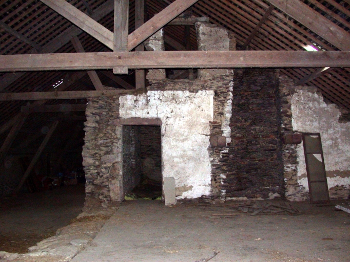 Vue d'ensemble de l'étage actuellement sous charpente : le logis, mur de cloisonnement de l'étage avec cheminée et porteImmatriculation