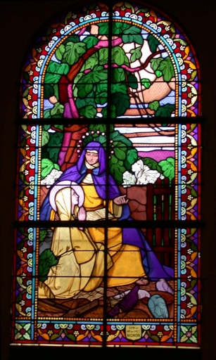 Verrières à personnages des baies 4, 6, 7 et 9 : Apparition du Sacré Coeur, Don des clés, Education de la Vierge, Couronnement de Charles VII,