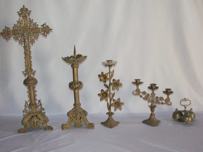 Croix d'autel, paire de chandeliers d'autel, paire 1 et 2 de chandeliers d'église, sonnette liturgiqueImmatriculation
