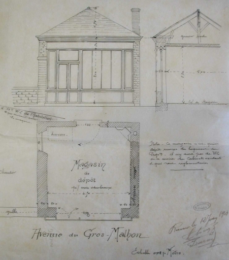Plan, élévation et coupe, par Lecoq, 1908 (A. C. Rennes)Immatriculation