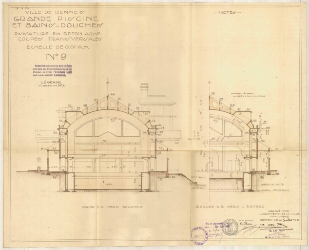 Grande piscine et bains-douches. Ossature en béton armé. Coupes, E. Le Ray, 1923 (A. C. Rennes ; 2 Fi 2597)Immatriculation