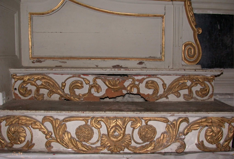Gradins d'autel : détail (attaque d'insectes xylophages)Immatriculation