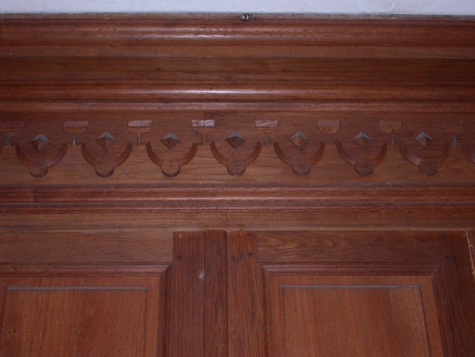 Ensemble de meubles de sacristie : chasublier, 7 armoires de sacristie, 3 placards, lambris de revêtement, bureau,