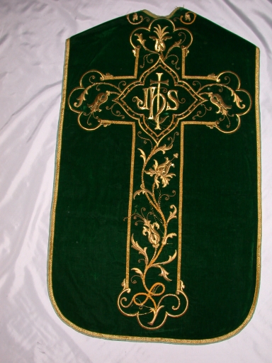 Ornement vert : chasuble, étole, manipule, voile de calice, bourse de corporal,
