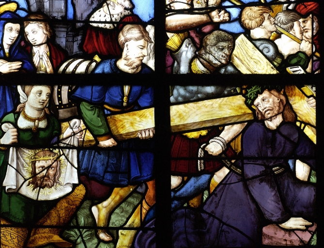 Verrière de la baie 5, partie inférieure : Vierge et saint Jean, Sainte Véronique, Joseph d'Arimathie, Chute du ChristImmatriculation