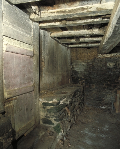Cloison, mangeoire et escalier en vis, vue prise de l'étable.Immatriculation