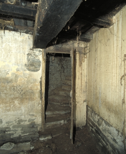 Cloison et escalier en vis, vue prise de la salle.Immatriculation