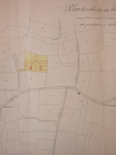 Plan des abords du bourg de Saint-Barthélemy indiquant les lieux destinés à l'établissement du presbytère et de la mairie école, 1868 (A.D. du Morbihan, série O)Immatriculation