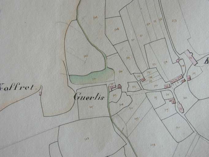 Moulin à eau de Guerlis. Plan cadastral 1829, section K2 (AD Morbihan, 3P)Immatriculation