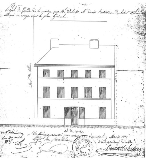 Projet de façade du n°4 rue Saint-vincent, 1835 par Brunet-Debaines. AM Vannes 1M.Immatriculation