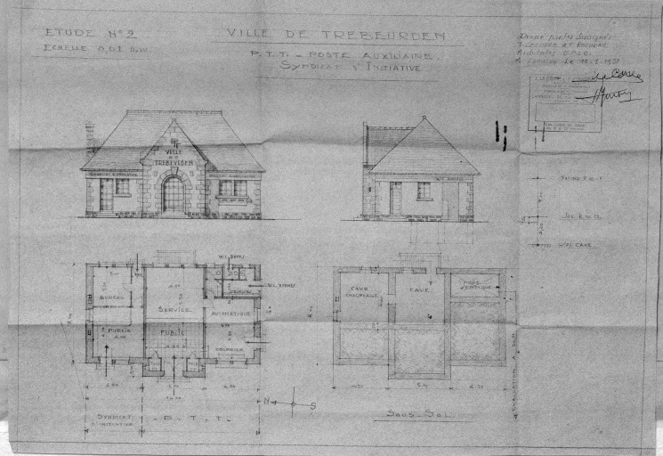 Ville de Trébeurden, poste auxilliaire, syndicat d'initiative. Etude n°2 (réalisée), plan et élévation, par Jean Le Corre et François Rousseau, 1951Immatriculation