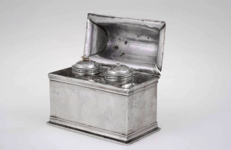 Boîte aux saintes huiles : vue générale ouverte biaiseImmatriculation