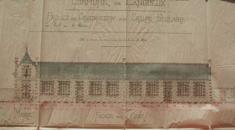 Premier projet de construction du groupe scolaire avec local pour la Mairie. Façade sur cour par Victor le Guen, le 21 octobre 1907 (AD 22).Immatriculation