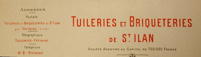 Papier à en-tête de la Société des Tuileries et Briqueteries de Saint-Ilan en 1920 (AD 22)Immatriculation