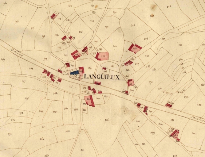 Le bourg de Langueux. Extrait du plan cadastral de 1812, section D (AD 22).Immatriculation