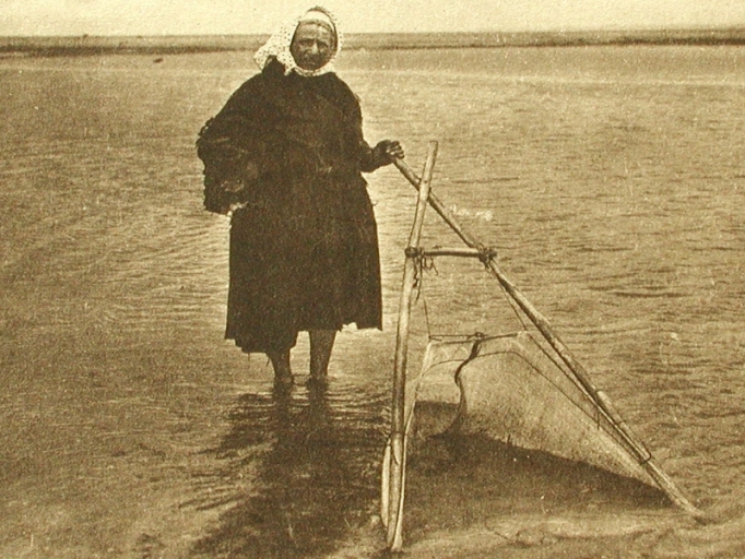 Pêcheuse de crevettes avec un havenet en croix traditionnel (ralingue libre)Immatriculation