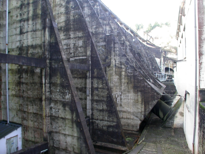 Vue générale des contreforts du barrage et des deux conduites forcées métalliques qui amènent l'eau aux turbines.Immatriculation