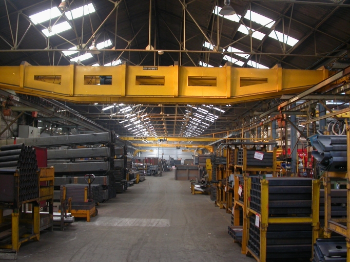 Vue intérieure de l'atelier de fabrication de matériel agricole et son pont roulant.Immatriculation