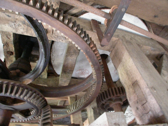 Détail d'une partie du hérisson et de la lanterne droite qui entraîne une des deux paires de meules.Immatriculation