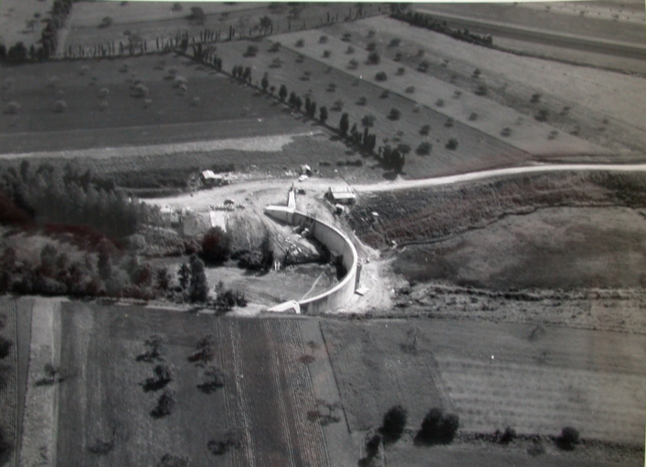Barrage de Bobital en construction, vue aérienne. Les travaux sont achevés le 31 juillet 1960.Immatriculation