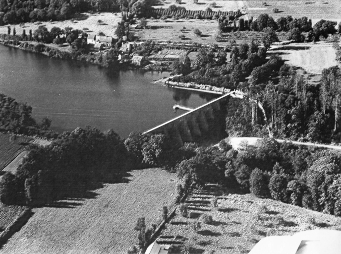 Barrage et étang du Pont-Ruffier desservant l'usine des eaux, vue aérienne (1972).Immatriculation