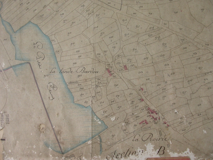 Cadastre ancien, 1823. Petit étang de la Hardouinais, site de production et logements (détail).Immatriculation
