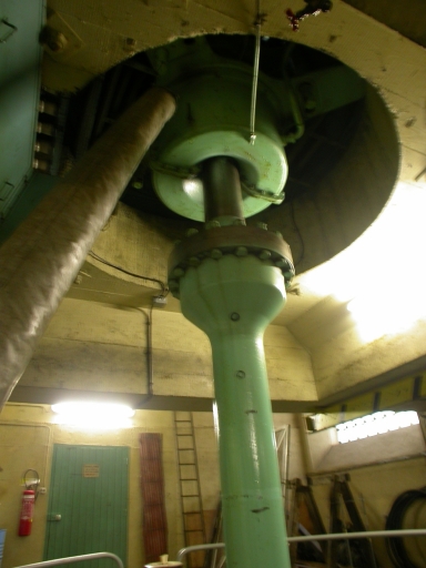 Arbre moteur de la turbine Kaplan relié à l'alternateur, situé juste au dessus, au rez-de-chaussée de la salle des machines.Immatriculation