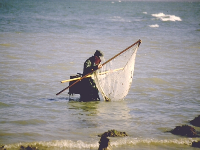 Pêcheur à pied relevant son havenet à crevettes sous le ventImmatriculation