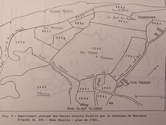 Dans : "L'industrie ancienne du sel dans le Penthièvre littoral" / Jacques-Henri Clément, Rennes : UHB, Rennes 1, Thèse d'Etat de Docteur en Pharmacie, 1989, P. 49.Plan cadastral.