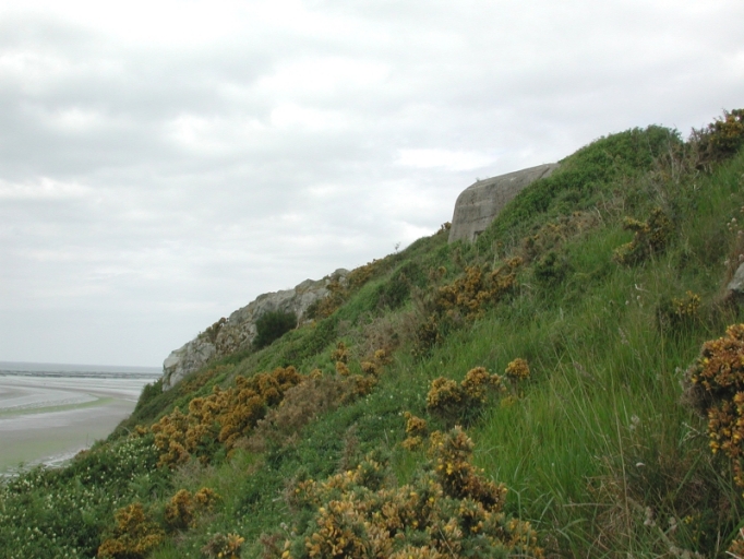 Vue en contre-plongée du blockhaus de la Pointe du Grouin, dans son environnement de falaiseImmatriculation
