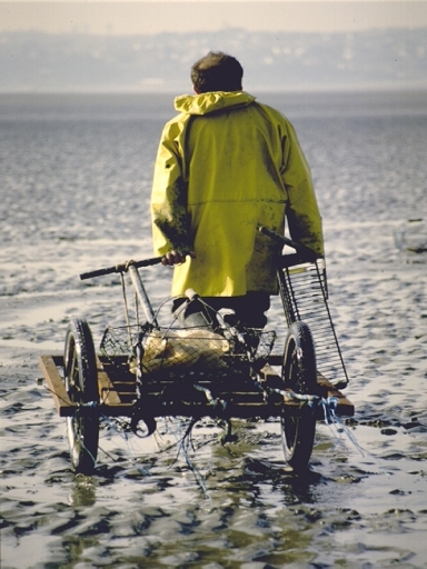 Pêcheur professionnel de coques et son équipement : grêle, râteau, carriole, panier en fil de ferImmatriculation