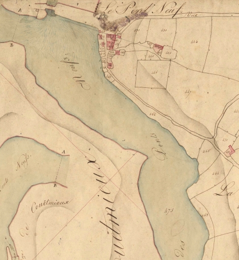 Vue générale de la chaussée des Ponts-Neufs. Extrait du plan cadastral de 1831 (AD 22)Immatriculation
