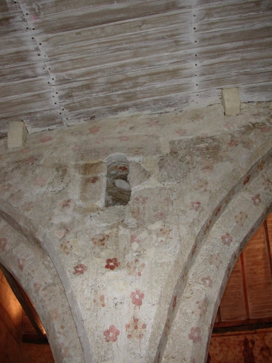 Mur séparant le bas-côté nord du choeur. Le jour datant de l'époque romane témoigne de la structure primitive du choeur.Immatriculation