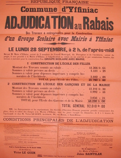 Annonce par voie d'affichage public de l'adjudication des travaux de construction du groupe scolaire et de la mairie d'Yffiniac, 1908 (Imprimerie Nouvelle / AD 22)Immatriculation