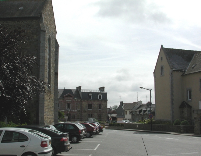 Vue générale de la place. Au premier plan, à gauche, le bras sud du transept de l'église paroissiale, à droite l'ancien presbytère, à l'arrière plan l'ancienne école publique des garçons et mairieImmatriculation