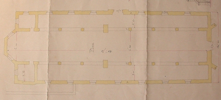Plan au sol de l'ancienne église paroissiale, 31 août 1887 (Le Guerrannic, architecte / AD 22).Immatriculation