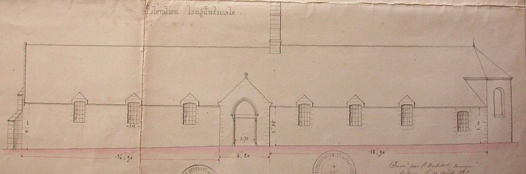 Elévation longitudinale de l'ancienne église paroissiale, 31 août 1887 (Le Guerrannic, architecte / AD 22).Immatriculation